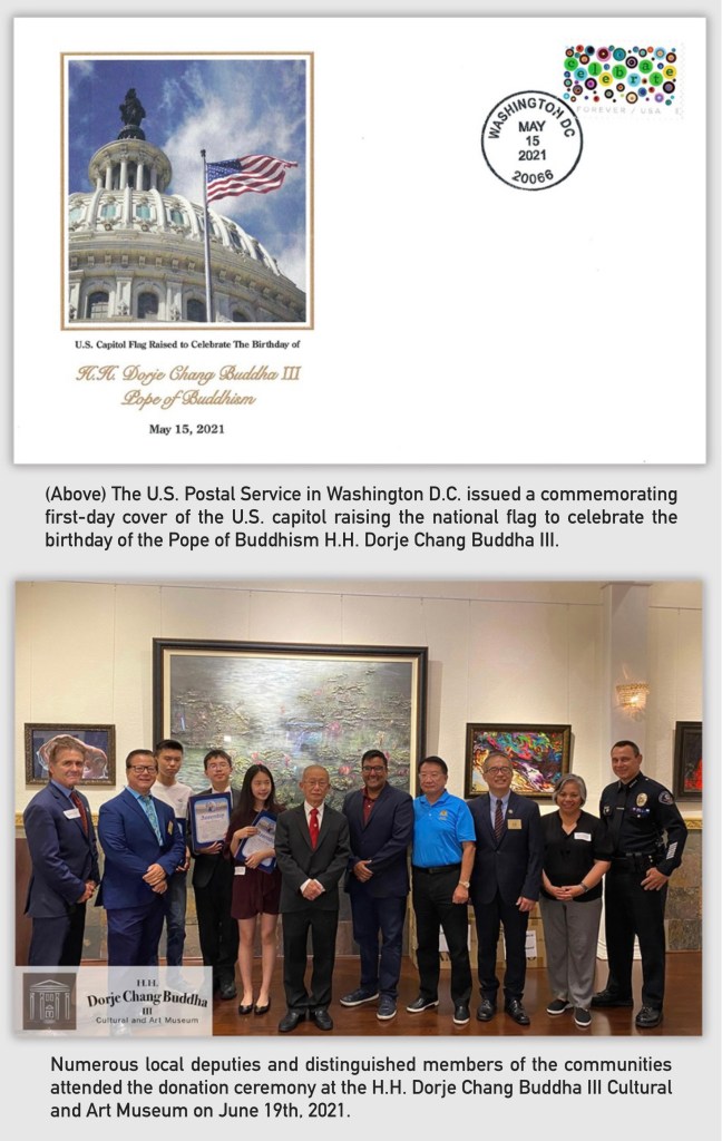 LOS ANGELES, CA, June 22, 2021 — The U.S. Capitol raised the national flag on May 15th, 2021 to send birthday congratulations and pay respect to the Pope of Buddhism H.H. Dorje Chang Buddha III. To celebrate this wonderful and auspicious day, the U.S. Postal Service in Washington D.C. issued a special commemorating first-day cover of the U.S. Capitol raising the national flag to celebrate the Birthday of the Pope of Buddhism H.H. Dorje Chang Buddha III. It was specially noted to be an official limited edition on the first-day cover.