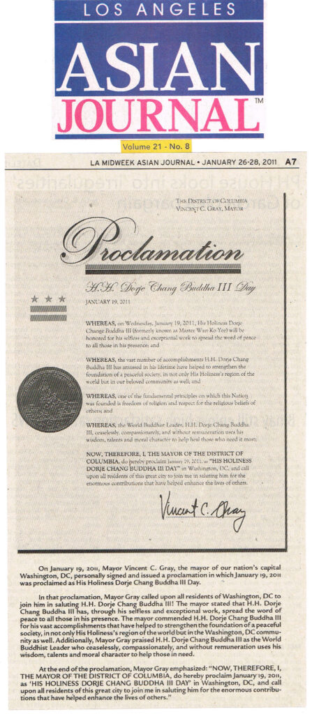 On January 19, 2011, Mayor Vincent C. Gray, the mayor of our nation’s capital Washington, DC, personally signed and issued a proclamation in which January 19, 2011 was proclaimed as His Holiness Dorje Chang Buddha III Day.