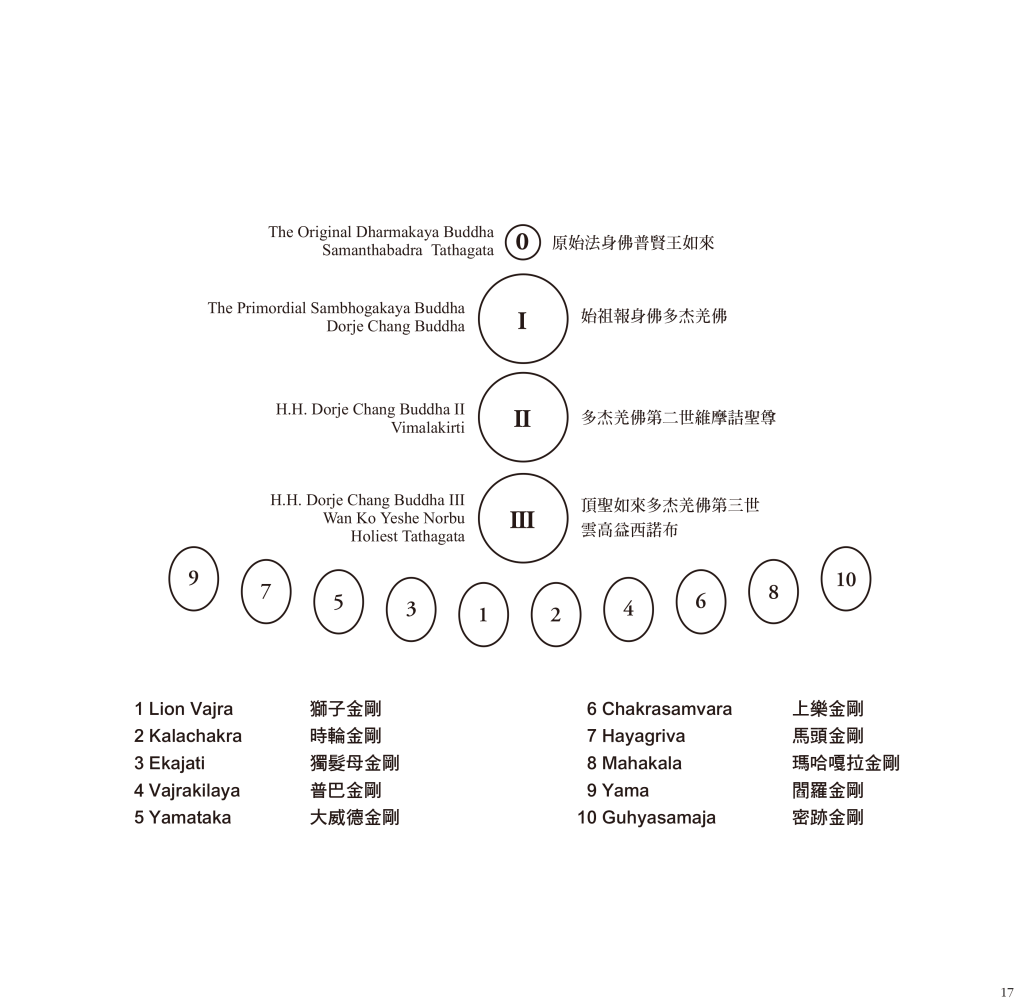 Based on this dharma, Samantabhadra Tathagata did not directly incarnate. Even the ancient Buddha Dipankara and Vajrasattva were the nirmanakayas of Dorje Chang Buddha. Sakyamuni Buddha was a disciple of Dipankara Buddha. However, many sects list Samantabhadra Tathagata as the first Buddha who began all the lineages in the dharmadhatu. This way of thinking is actually not erroneous. That is because although Samantabhadra Tathagata is a dharmakaya without form and has no way of speaking, the origin lies with this dharmakaya from which the sambhogakaya Dorje Chang Buddha manifested. This sambhogakaya Buddha was the first one to spread the Buddha-dharma and save living beings in the three spheres of existence so that they would become holy beings.