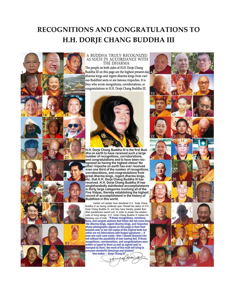 Certain evil people have slandered H.H. Dorje Chang Buddha III as having conferred upon Himself the status of H.H. Dorje Chang Buddha III, and they have thereby guided Buddhist practitioners toward evil. In order to protect the wisdom roots of living beings, H.H. Dorje Chang Buddha III makes the following vow of truth: “If those recognitions, corroborations, and congratulations that follow did not come from the dharma kings, regent dharma kings, and rinpoches whose photographs appear on this page of from their temples and/ or are not copies of the original texts but rather are my fabrications with forged signatures – if even one such case exists – then i should descend into hell without the possibility of ever leaving hell. If those recognitions, corroborations, and congratulations were written or typed by them as well as signed and/ or stamped by them, the merit of this truth will bring to everyone wonderful blessings and wisdom! Vow Maker- Dorje Chang Buddha III“