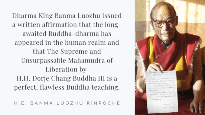 Great Dharma King Banma Luozhu is the incarnation of Buma Mozha, who was the Master of Guru Padmasambhava. In 1998, he decided to pass away in a state of liberation. Dharma King Jigme Phuntok urged him to stay in the world. Dharma King Banma Luozhu issued a written document stating that the Buddha-dharma for which he had been longing for more than two thousand years has finally appeared in the human realm! That document also stated that The Supreme and Unsurpassable Mahamudra of Liberation written by H.H. Dorje Chang Buddha III is the holy teaching of a Buddha and is perfect, flawless Buddha-dharma!