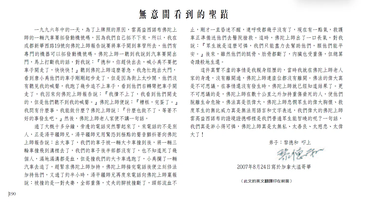 This is a true story that I personally experienced. I was at the side of the Buddha Master and did not leave His Holiness. The Buddha Master did not even get up from His seat. The magnificence of the Buddha-dharma is truly incredible. The Buddha Master already knew the results before the accident even occurred. What is even more incredible is that from several dozen kilometers away the Buddha Master empowered (blessed) people who had suffered serious injuries and were on the brink of death, saving them from a life-threatening situation. The Buddha-dharma is truly magnificent. It is truly impossible to describe orally or in writing the magnificent heart of the Buddha Master that takes pity upon living beings and the incomparable power of the Buddha Master that saves living beings. How can we as ordinary living beings understand the state of realization and virtue that our magnificent Buddha Master, H.H. Wan Ko Yeshe Norbu, possesses? In short, we truly are pitifully tiny. The Buddha Master truly is extremely selfless, extremely kind, extremely compassionate, and extremely magnificent!